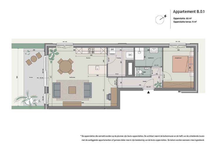 Appartement B 0.1 bevindt zich op het gelijkvloers en heeft een bewoonbare oppervlakte van 80 m² en een ruim terras van 11 m². Dit is een zeer ruim een slaapkamerappartement, met open ingerichte keuken, lichtrijke leefruimte, aansluitend aan de keuken berging met aansluiting voor droogkast en wasmachine,. Badkamer met lavabomeubel en douche. Een schuifraam vanuit de leefruimte geeft toegang tot het mooi zonneterras (zuidelijk georiënteerd). Alle appartementen hebben zicht op groene buitenruimte en zijn voorzien met de meest energiezuinige technieken: warmtepomp, zonnepanelen, vloerverwarming, ventilatie D. Deze appartementen hebben allemaal een E peil max 10! Er zijn ondergrondse autostaanplaatsen en bergingen te koop. Zowel ondergronds als bovengronds is er mogelijkheid tot het plaatsen van fietsen. Bovengronds zijn er bezoekersparkings met laadinfrastructuur en er zal ook een deelwagen ter beschikking zijn. Deze residentie bevindt zich vlakbij het centrum van Boortmeerbeek met alle voorzieningen zoals scholen, winkels, openbaar vervoer. Treinstation op wandelafstand. Heb je vragen? Contacteer dan je bouwadviseur via 0800 62 732 of mail naar info@durabrik.be. Download de brochure via https://durabrik.immo/boortmeerbeek * Beelden en oppervlaktes zijn indicatief.   Renovatieplicht: nee
