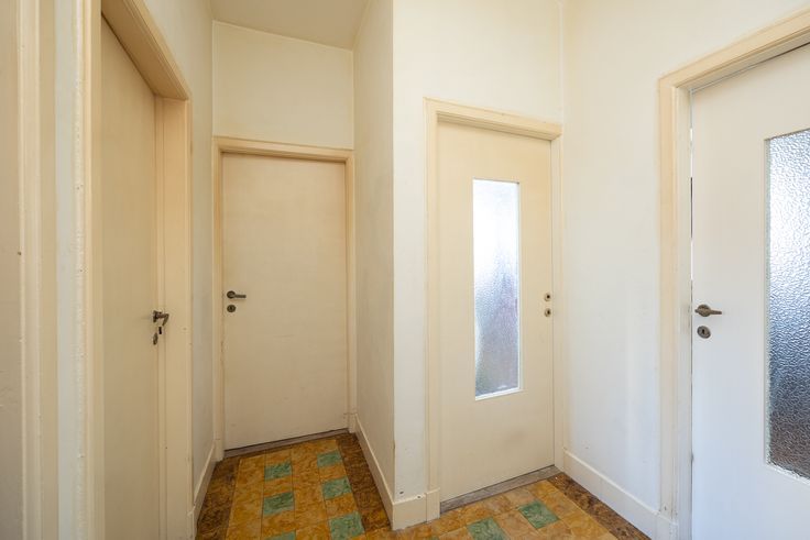 Op het gelijkvloers vinden we de gezamenlijke inkomhal en het éénslaapkamerappartement (62m²) met koer.