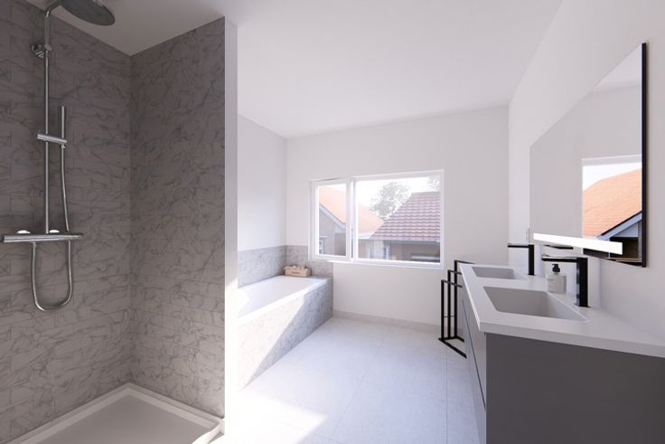 Maison 3 chambres avec jardin et garage, à deux pas de la place et des commerces Caractéristiques générales : hall d'entrée, wc séparé avec lave-mains, séjour avec espace cuisine ouvert (cuisine non comprise), buanderie. Au 1er étage, 2 chambres, salle de bains avec douche, baignoire, meuble vasque, WC séparé sur le palier. Sous combles, 1 chambre, espace dressing et coin grenier. Jardin clôturé, terrasse carrelée, portillon et garage Caractéristiques techniques : châssis PVC noir double-vitrage, seuils en pierre bleue, porte d’entrée en PVC noir, porte de garage basculante noire, portes intérieures prêtes à peindre avec clinches en inox, tablettes de fenêtre en marbre blanc ou en pierre bleue adoucie avec contre bord, escalier en hêtre, chauffage central au gaz, chaudière avec boiler séparé de 70 litres, radiateurs, thermostat, VMC double flux, carrelage dans la pièce de vie et dans la salle de bain avec plinthes assorties, faïences autour de la baignoire ainsi que dans la douche avec plinthes assorties, parquet dans les chambres, clôtures mitoyennes, jardin non engazonné, tout à l'égoût, puit de contrôle, siphon à cloche, citerne de récupération d’eau de pluie de 10.000 litres (pompe électrique placée), 5 panneaux solaires, accès au garage en pavés autobloquants 8.000 € HTVA offerts pour l’achat d’une cuisine chez Vervenne ! PEB visé : A Livraison prévue 1er trimestre 2025 Prix affichés hors frais - Vente sous régime des droits d'enregistrement 12,5% sur le terrain et TVA 2