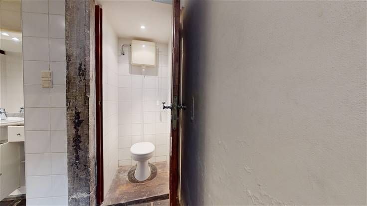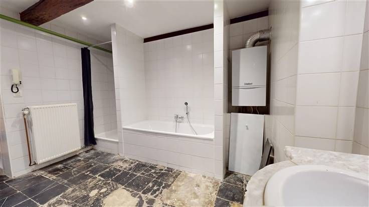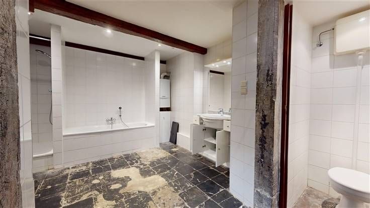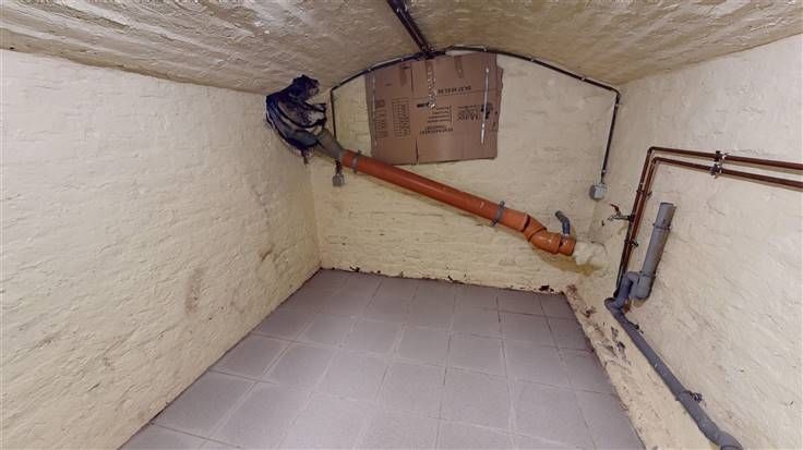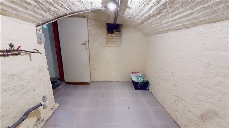 Sous-sol : 1 w.c., salle de bains (+/-23 m², avec baignoire, douche et meuble lavabo), 1 cave (+/-6 m², avec emplacement machines) et coin débarras.