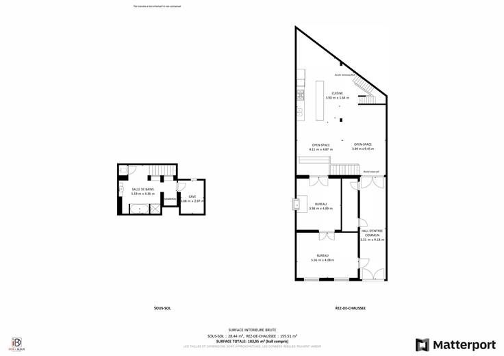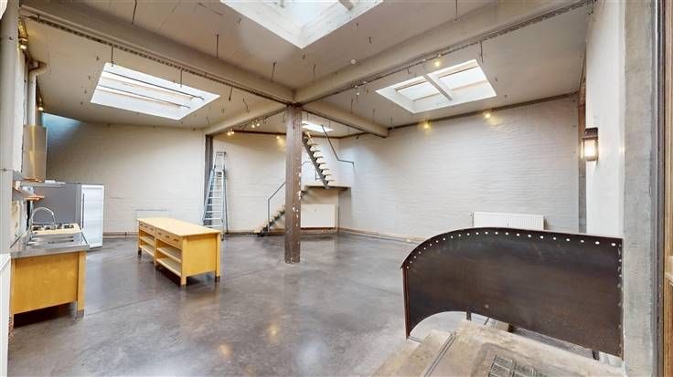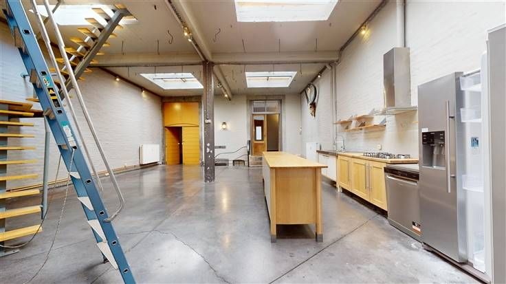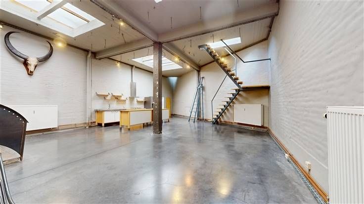 Rez-de-chaussée : hall d'entrée commun à l'immeuble (+/-21 m²), spacieux espace "open space" (+/-79 m²) avec espace cuisine équipée (avec frigo américain, taque au gaz, hotte, lave-vaisselle, meubles évier et de rangement) et accès au sous-sol, 2 pièces bureaux/salle de réunion (+/-19 m²).