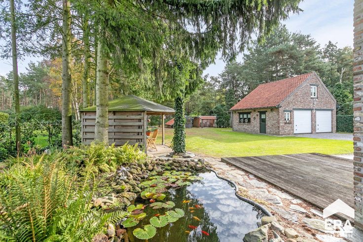 Prachtige tuin met siervijvers, volledig omheind engelegen tegen een bos.