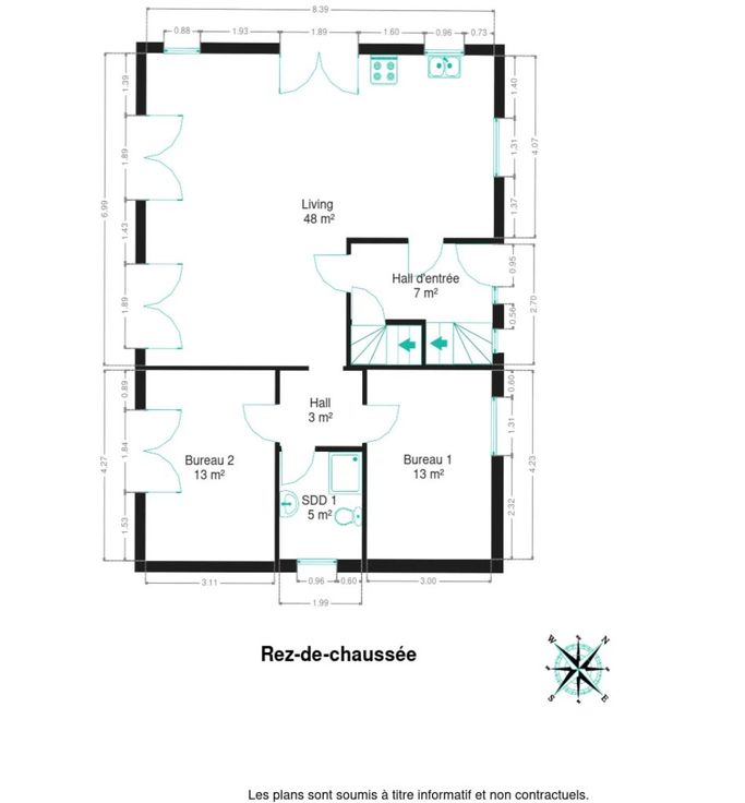 De begane grond bestaat uit een hal met apart toilet, een grote, lichte woonkamer met open inbouwkeuken, twee slaapkamers/kantoren en een doucheruimte.