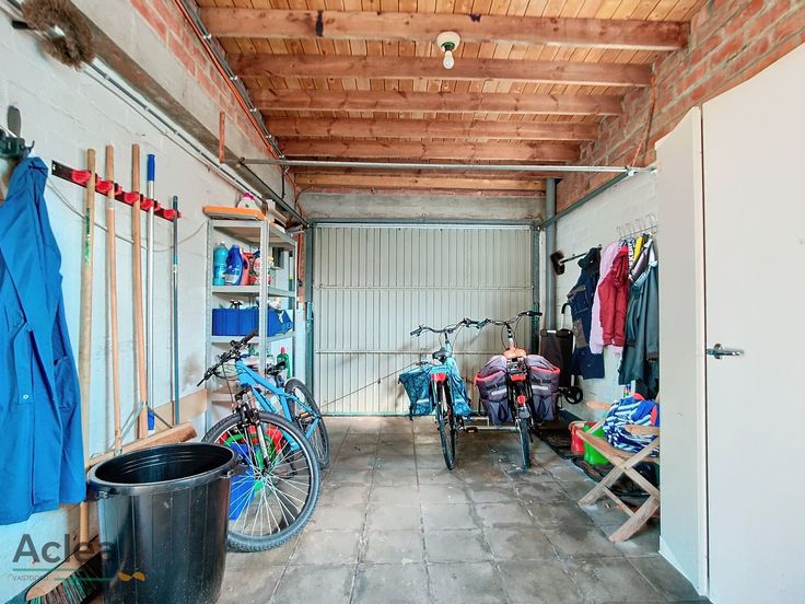 inkomhal met inbouwkast, toilet, woonkamer met zicht op de grote tuin, keuken, badkamer met lavabo en ligbad, 3 slaapkamers, garage, terras en ruime berging/bijhuis in de tuin.