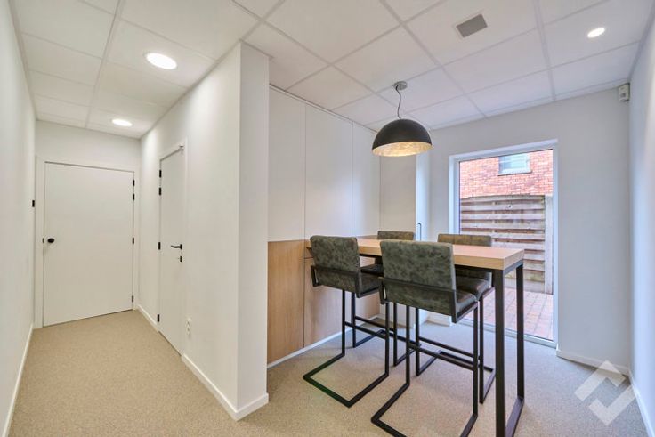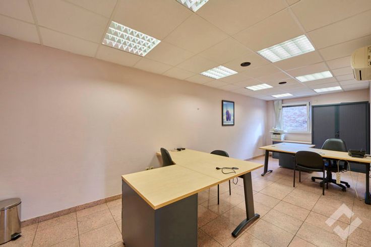 De gelijkvloerse verdieping is recent volledig vernieuwd en heeft een moderne uitstraling. Vooraan is er een mooi onthaal en de rest van de ruimte is ingedeeld in verschillende kantoorruimtes met ook de aanwezigheid van een keuken en toiletten.