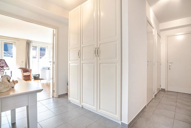 De ruime inkomhal met ingemaakte kasten geeft toegang tot de ruime leefruimte die geniet van een overvloed aan lichtinval dankzij de vele raampartijen die toegang geven tot een zonnig balkon. Aansluitend aan de leefruimte treffen we de open keuken.