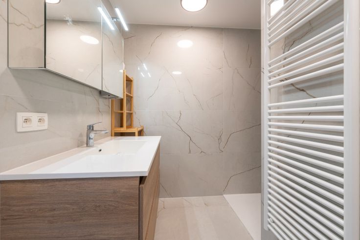 Het moderne messing aluminium schrijnwerk zorgt voor een verfijnde, eigentijdse toets in het hele appartement. De badkamer is afgewerkt met grote tegels in carreralook en beschikt over een inloopdouche en een strak lavabomeubel, wat de ruimte een luxueuze spa-uitstraling geeft. Daarnaast is er een ruime berging, een afzonderlijk gastentoilet