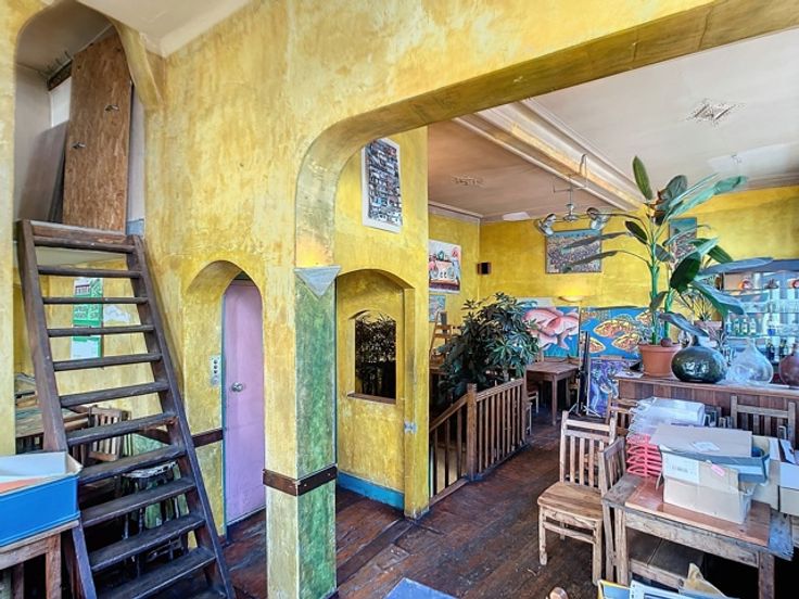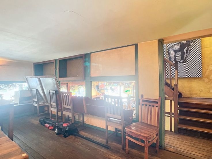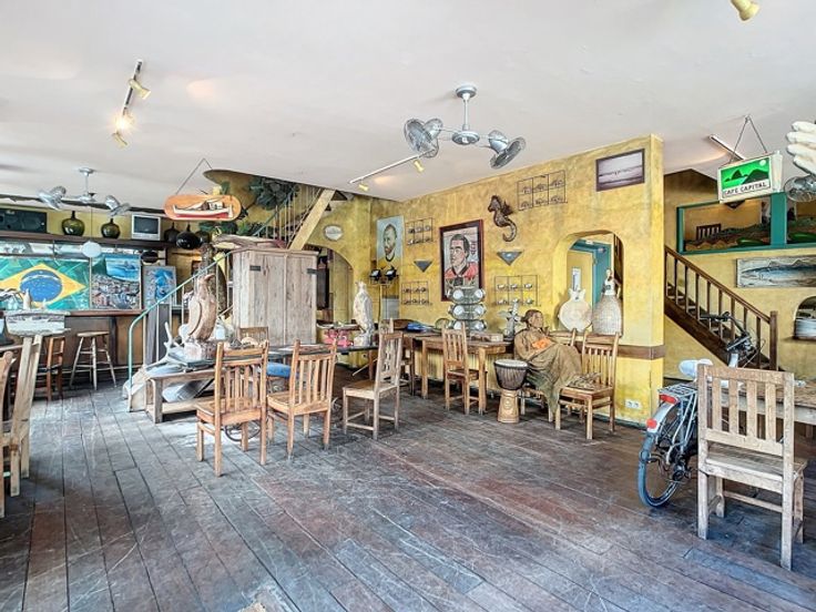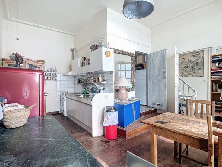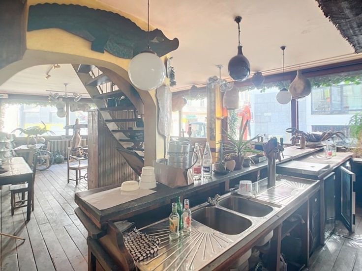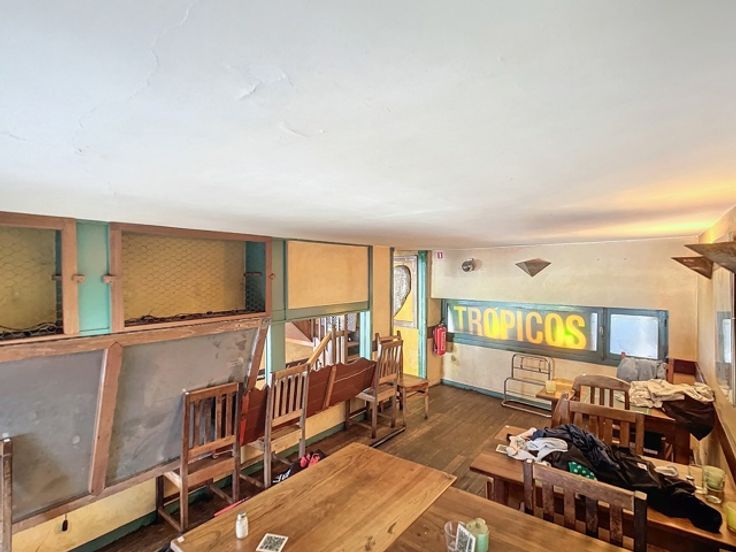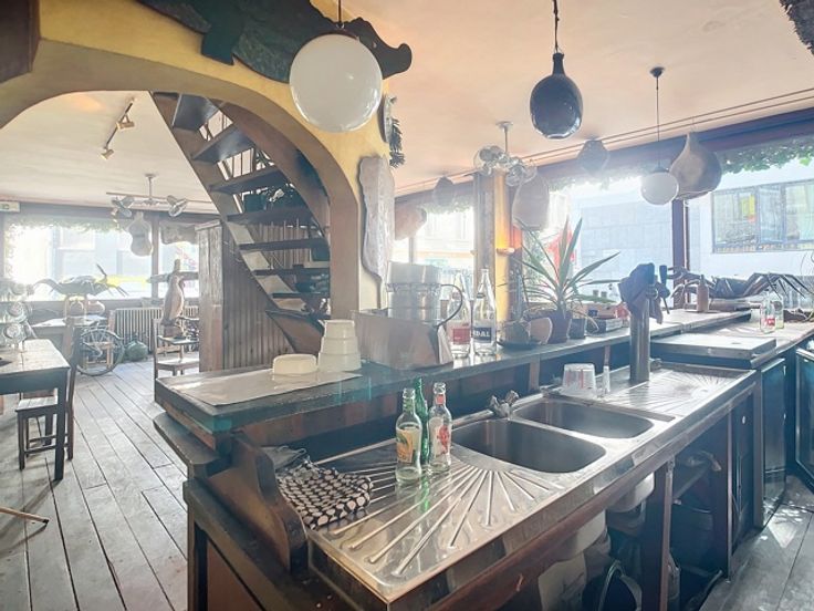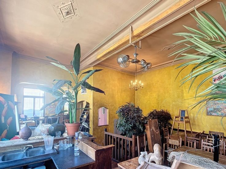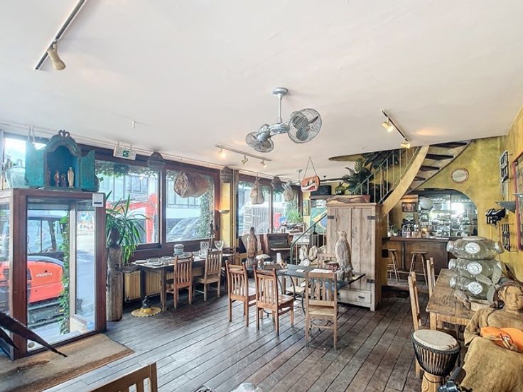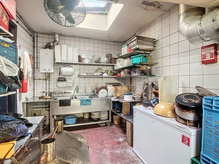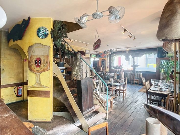 Op de gelijkvloerse verdieping bevindt zich een ruime eetgelegenheid met een gezellige toog, ideaal voor horeca-activiteiten. Op een lager niveau ligt de goed uitgeruste keuken, aangevuld met sanitaire voorzieningen. Boven de keuken, op het mezzanine-niveau, is er nog een extra verbruiksruimte gecreëerd, wat bijdraagt aan de efficiëntie en veelzijdigheid van het pand.