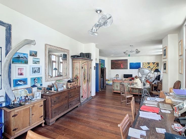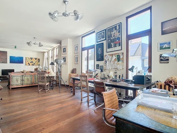 De tweede verdieping, eveneens bereikbaar via lift of trap, biedt een ruime leefruimte met hoge plafonds en veel natuurlijk licht. Daarnaast is er een keuken en een volledig uitgeruste badkamer aanwezig, waardoor deze verdieping ook geschikt is voor residentiële bewoning of kantoorruimte.