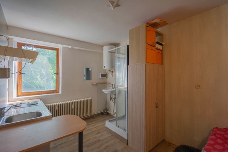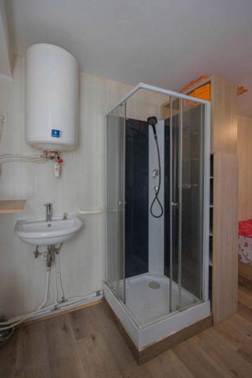 Bestaande uit: woonkamer met open keuken en doucheruimte, apart gedeeld toilet. Elektriciteit in overeenstemming.