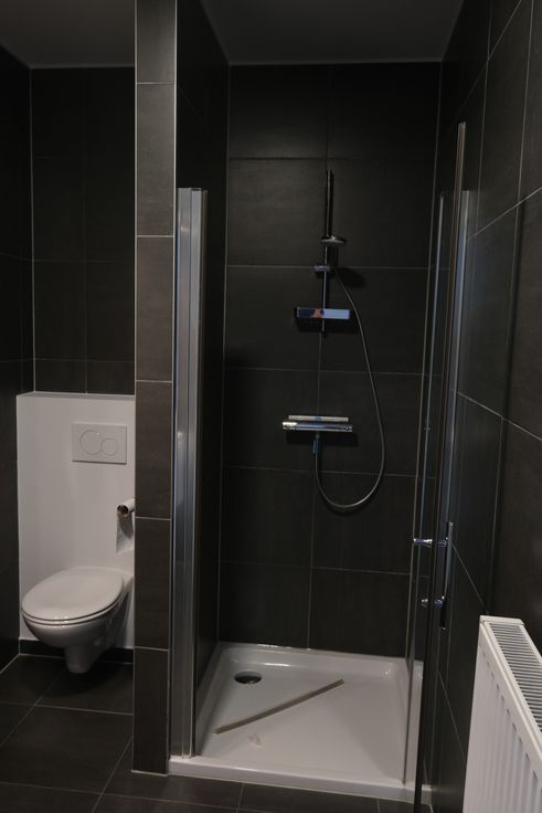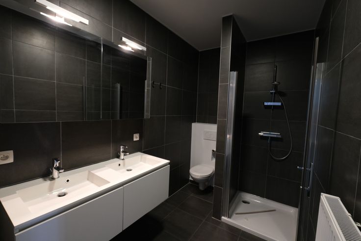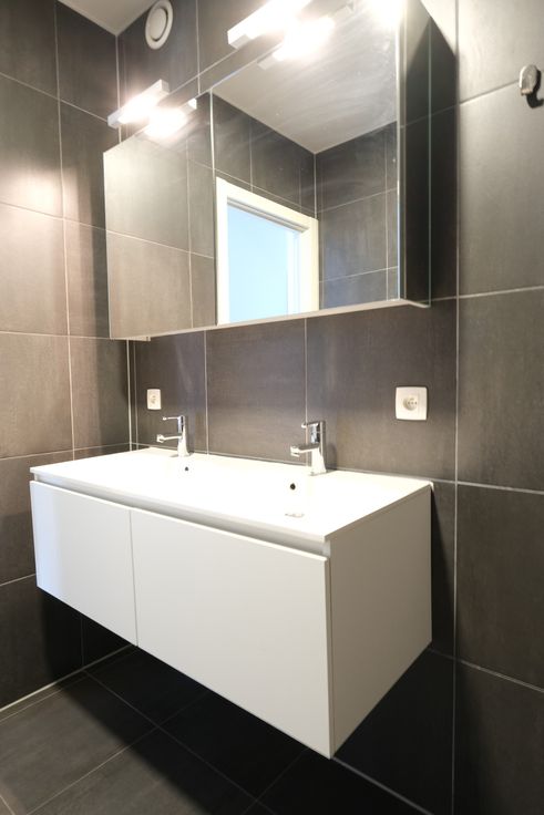 De badkamer heeft een douche, een toilet en een dubbele wastafel. Voor de opberging is er een ruime spiegelkast voorzien.