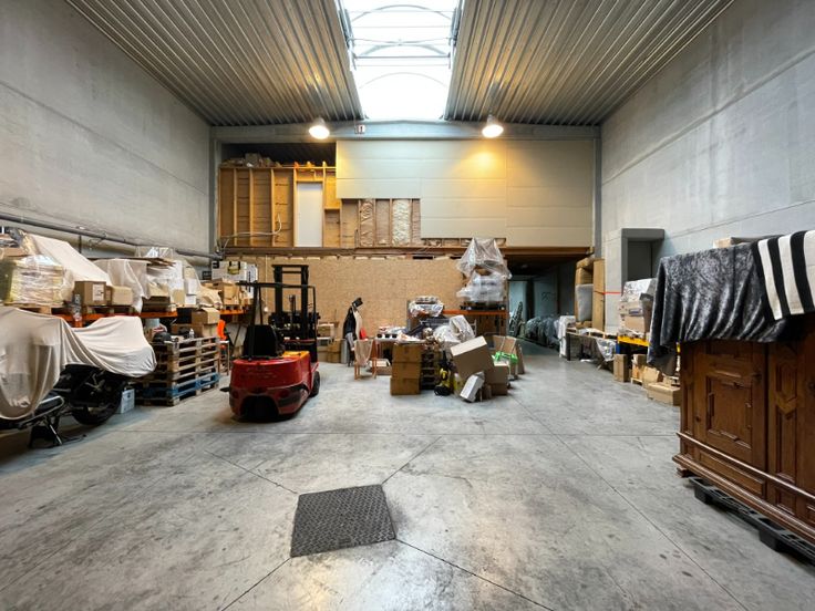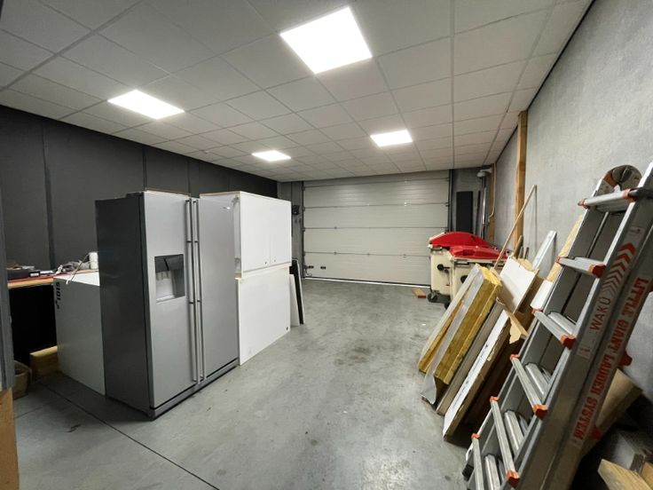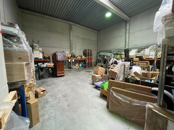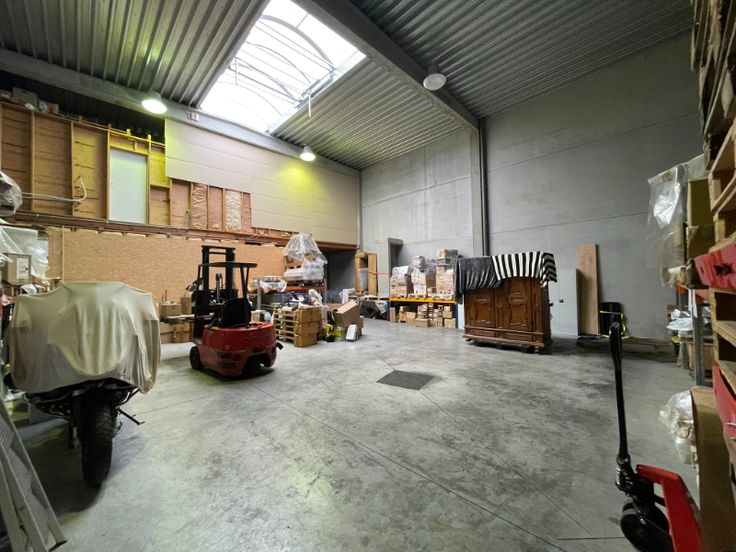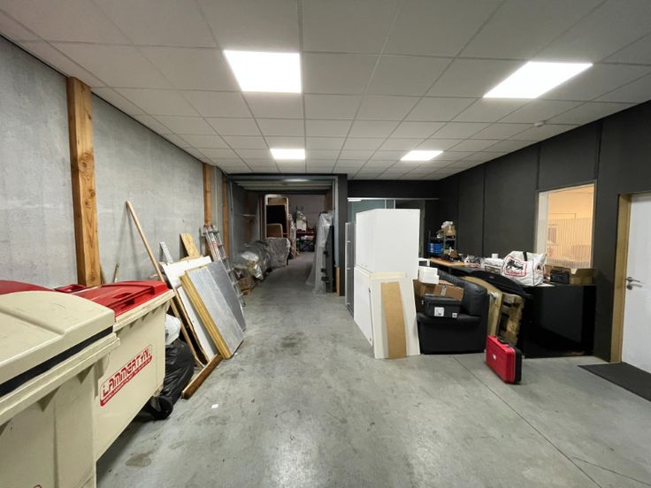 Magazijn: 294m², voorzien van betonstructuur, geïsoleerde betonnen wanden en ruime glaspartijen in de voorgevel. Uitgerust met een polybetonvloer, automatische sectionaalpoort, steeldeck met lichtstraat en rookluik, en functionele verlichting.