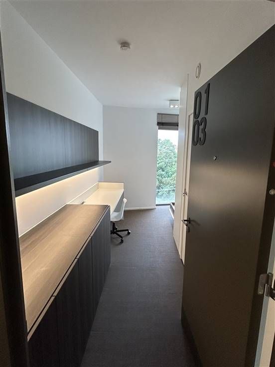 Onmiddellijk beschikbaar wegens stopzetting studies! Moderne kamer gelegen in studentenresidentie Woods, vlakbij het Belle-Vue park. De residentie is gelegen op een boogscheut van het centrum van Leuven, op wandelafstand van het station en nabij verschillende campussen. De kamer is voorzien van een uitklapbaar tweepersoonsbed (140cm x 200cm - matras niet incl.), ingebouwde kleerkasten, waardoor er meer dan voldoende opbergruimte is. De kamer heeft ook een ingebouwde bureau met boekenplank en persoonlijke frigo met vriesvak. Verder beschikt de kamer over een persoonlijke badkamer met douche, lavabo en toilet. De fietsenstalling is bereikbaar met de lift of via de trappenhal. Per verdieping zijn er twee keukens, die gedeeld worden met maximaal 10 personen. De keukens zijn voorzien van een oven, microgolf, vitro-keramische kookplaat, eettafel, wastafels en een persoonlijke opbergkast die op slot kan. Elke keuken heeft ook zijn eigen terras. Er is ook een gemeenschappelijke ontspanningsruimte met televisie, zetels, tafels en een kickertafel. Verder is er ondergronds nog een afsluitbare fietsenstalling, afvallokaal en een wasplaats met wasmachine en droogkast. De prijs bedraagt €625/maand exclusief provisie nutsvoorzieningen (45euro/maand) *De Foto's in de advertentie zijn van een gelijkaardige studentenkamer. Interesse? Contacteer ons via 0470 55 64 24 of student@immolivit.be