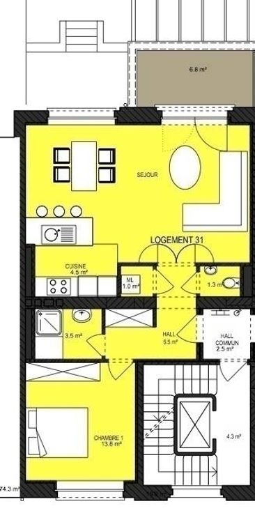 IXELLES (Louise - Etangs d'Ixelles - Flagey), dans un immeuble de standing, au 3ème étage, splendide appartement de +/- 74m² + terrasse 7m², comprenant: hall d'entrée, vestiaire, wc séparé, living tout en parquet, cuisine américaine BULTHAUP full équipée avec électroménagers SMEG, 1 grande chambre (en parquet) + armoires encastrées, salle de douche (douche + lavabo), buanderie, cave n°7, local vélo et poussette, local poubelle et grand jardin commun. Double vitrage partout. Chaudière individuelle au gaz. Finitions contemporaines !! Bail société OK! Libre le 1er décembre 2024. Pour conditions et visites: 02 344 88 84 / rent@tribel-immo.be / www.tribel-immo.be PEB: C, 26kg de CO2/(m².an).