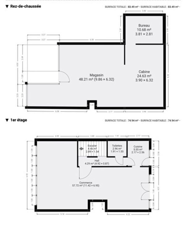 Rez-de-chaussée : Surface commerciale d’environ 83 m², actuellement en activité. Grande visibilité avec une vitrine donnant sur la rue. L’espace est aménagé de façon à offrir un cadre fonctionnel et adaptable selon les besoins commerciaux, avec une entrée, un espace principal et des locaux techniques ou de rangement à l’arrière.