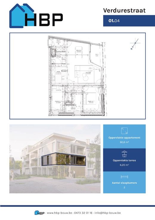 Welkom bij Project Verde, een uniek nieuwbouwproject dat luxueus wonen combineert met duurzaamheid in de groene Verdurestraat. Met 8 stijlvolle appartementen, 2 exclusieve penthouses met riante terrassen en een handelspand, biedt Project Verde de perfecte mix van comfort en verfijning. Appartement 1.4 heeft een oppervlakte van 91 m² en een terras van 6 m². Dankzij de uitstekende ligging in het centrum van Oudenaarde geniet u van alle stadsvoorzieningen binnen handbereik, terwijl u thuiskomt in een oase van licht en ruimte. De grote raampartijen zorgen voor een overvloed aan natuurlijke lichtinval en de tijdloze architectuur straalt klasse uit. Project Verde is niet alleen esthetisch aantrekkelijk, maar ook toekomstgericht. Met een energiepeil van E30 is dit project een toonbeeld van energiezuinig wonen. Luxueuze afwerking, duurzaamheid en wooncomfort komen hier samen. Ontdek de toekomst van wonen in Oudenaarde, ontdek Project Verde.