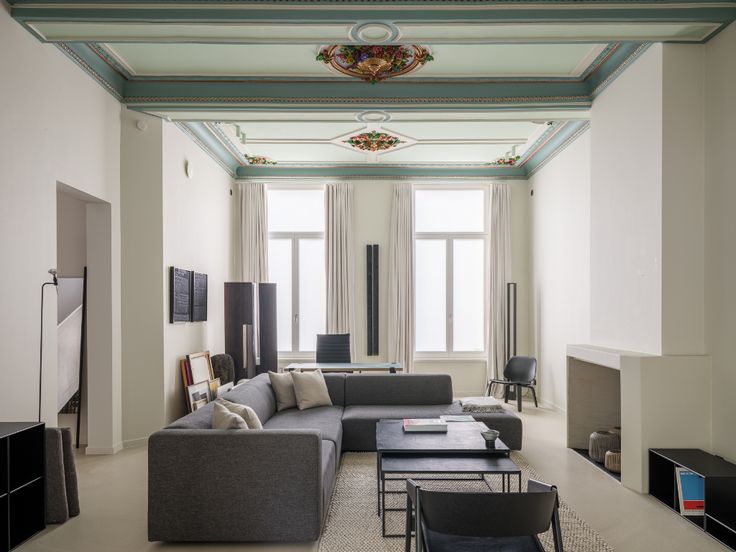 Aan de voorzijde van de woning vinden we een bijzondere ruimte die plaats geeft aan de woonkamer. Hoge plafonds, uitmuntende molures… in combinatie met de connectie naar de aanpalende ruimtes die een industrieel ‘loft’ gevoel met zich meebrengen zorgen voor een unieke beleving.