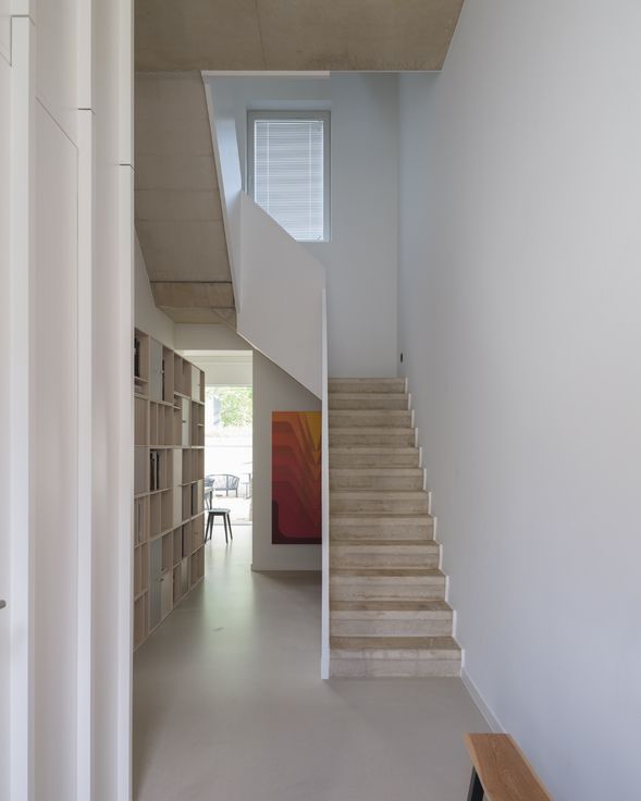 We betreden de woning langs de inkomhal voorzien van een gastentoilet, plaats voor vestiaire en architectonische trap.