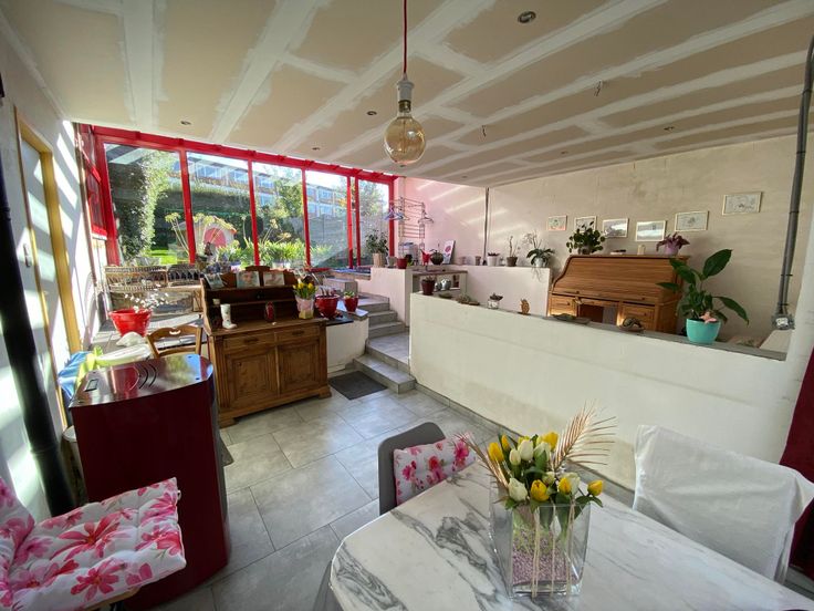 Située dans un chouette quartier, cette maison unifamiliale à rénover, se compose au rez, d'un hall d'entrée, un séjour de 28 m² une salle à manger de 23 m², un espace cuisine à aménager, une terrasse intérieure sous véranda, une buanderie et une salle de douche.