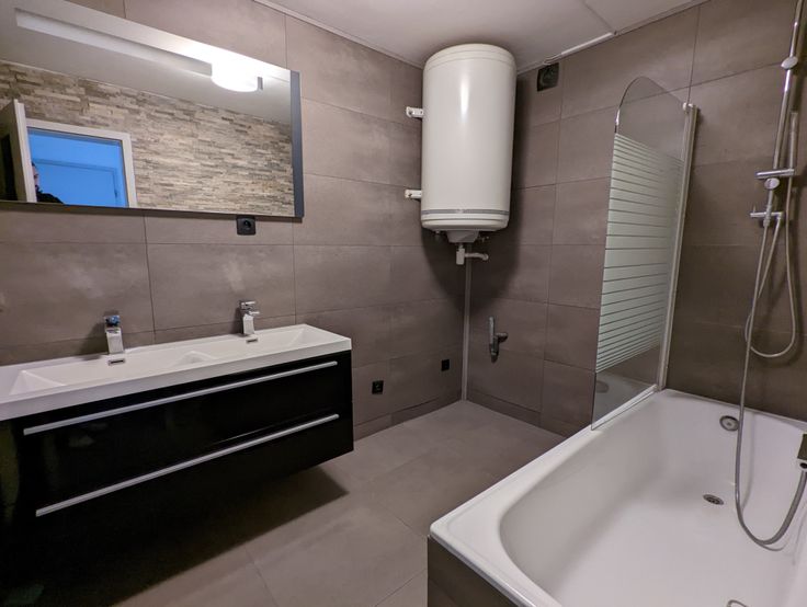 Espace buanderie et une belle salle de bain avec baignoire/douche d'un meuble double vasques.