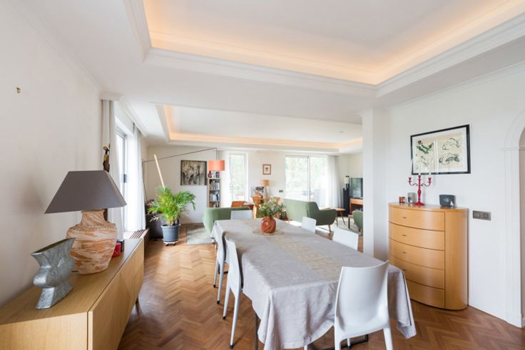 UKKLE, wijk De Fré, dicht bij alle voorzieningen, prachtig APPARTEMENT (4slpkm/2bdkm) van in totaal ±199m² in duplex met PARKEERPLAATS. Gelegen op de 3de en 2de verdieping van een gebouw van 5 verdiepingen, bestaat het appartement op de 1ste verdieping uit een inkomhal met gastentoilet en vestiaire, een prachtige woonkamer met eethoek en salon met toegang tot twee terrassen van ±9,5m² en ±10,5m² met een aangenaam boszicht, een keuken van ±14m², een master suite bestaande uit een dressing, badkamer met (bad, douche, dubbele wastafel) en een slaapkamer van 15m² met ingebouwde kasten. Op het souplex, nachthal, slaapkamer n°2 van ±14,5m² met balkon, apart toilet, tweede nachthal met op maat gemaakte kasten, slaapkamer n°3 van ±12m², badkamer (bad, wastafel), wasruimte, slaapkamer n°4 van ±15m². Op de begane grond, optionele parkeerplaats (+€20,000) en kelder. EPC : D-. Elektriciteit conform. Aluminium ramen met dubbele beglazing. Bijkomende kosten: 750€/maand (verwarming, water, oproepen reservefonds, lift, conciërge, beheermaatschappij, onderhoud, tuinonderhoud, elektriciteit en verwarming voor de gemeenschappelijke ruimten, verzekering, diverse werken) + 250€/maand voor een lening die eindigt in 2028. Gemeenschappelijke CHP-ketel op gas. Optie om een tweede parkeerplaats te huren voor €80/maand. Een ideaal gelegen woning om snel te ontdekken me