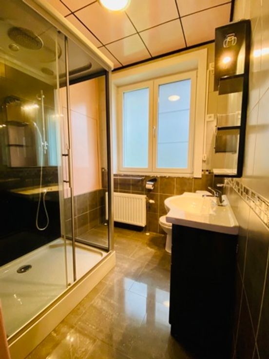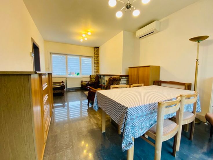 Rez-de-chaussée (85m2) : Hall d'entrée (6m2), living (25m2), cuisine équipée (7m2), salon (17m2), salle de douches (4m2), WC avec lave-mains, chambres (12 et 10m2)