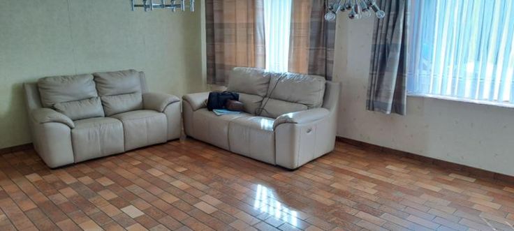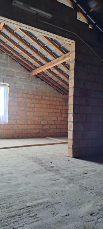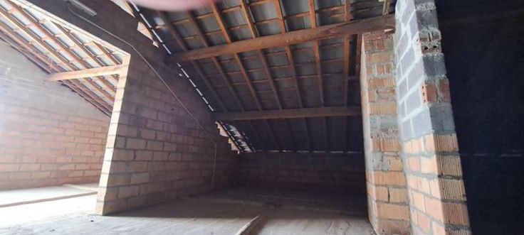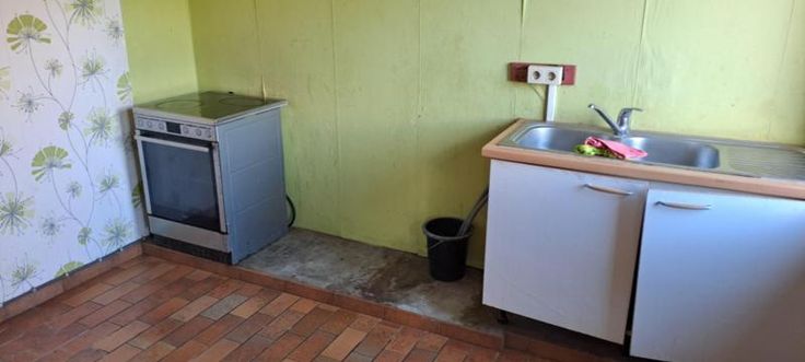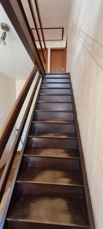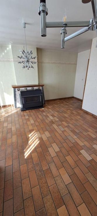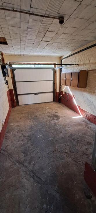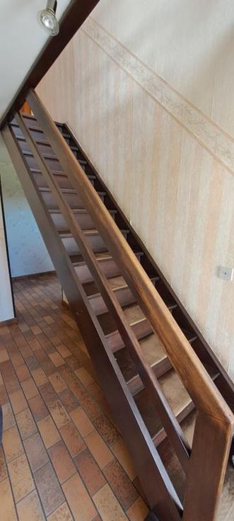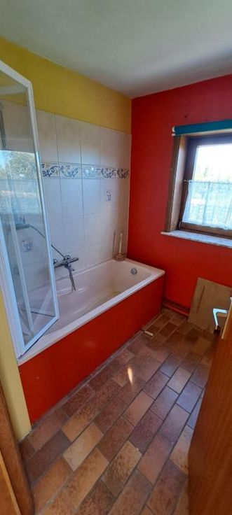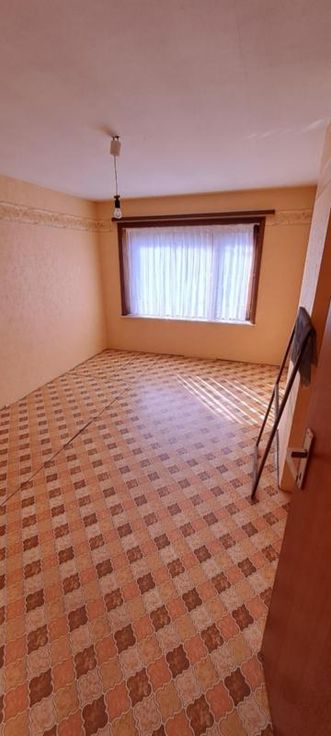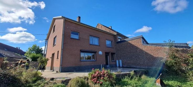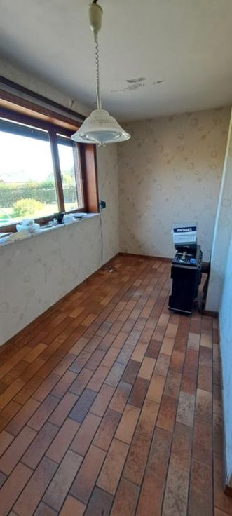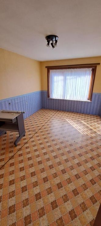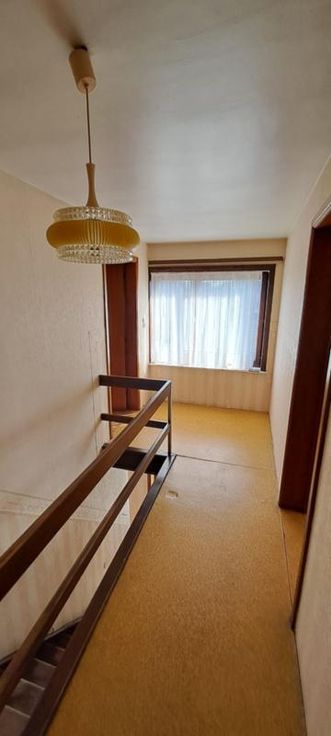 Maison 3 façades de 1976, sur et avec 1 are 99 ca, à rénover. Comprenant au rez : hall avec WC, living, petit séjour, cuisine non équipée, garage avec porte manuelle. A l'étage : 1 sdb avec baignoire et lavabo (d'époque), 5 chambres, grenier aménageable mais non isolé, accessible par une trappe. Terrasse et petit jardin. Simple vitrage avec châssis bois. Pas de chauffage central (convecteurs mazout avec cuve 1000L au garage). Fosse septique (pas d'égout).