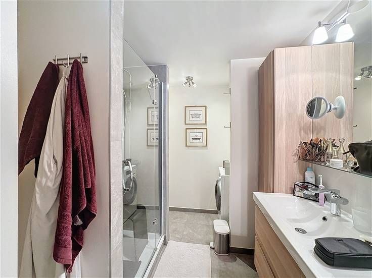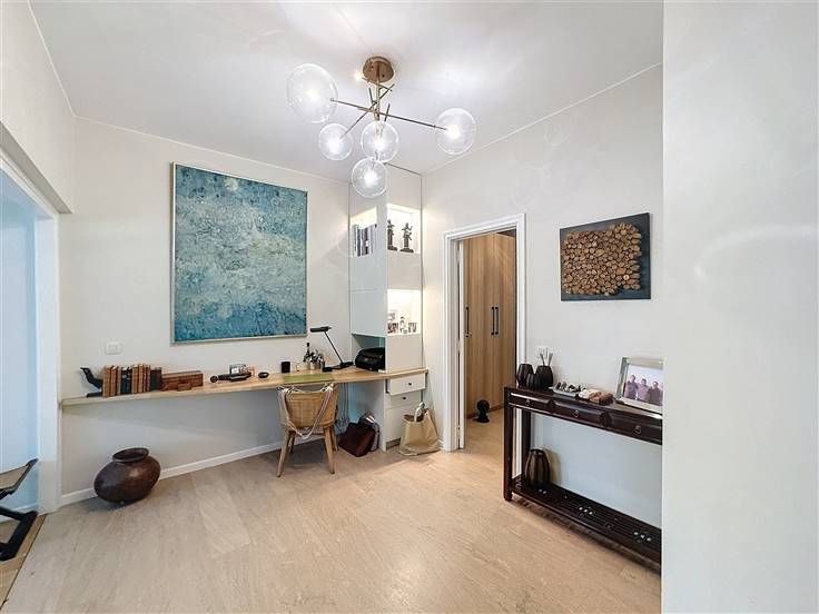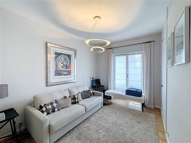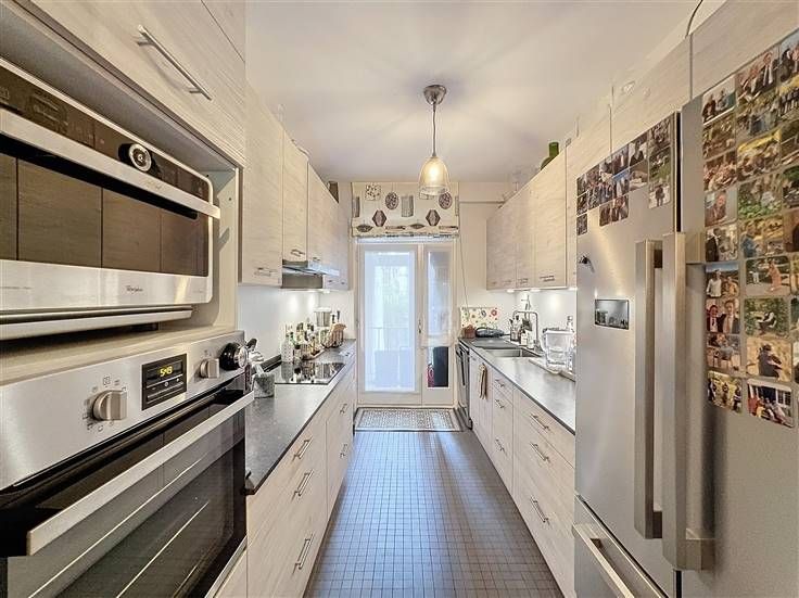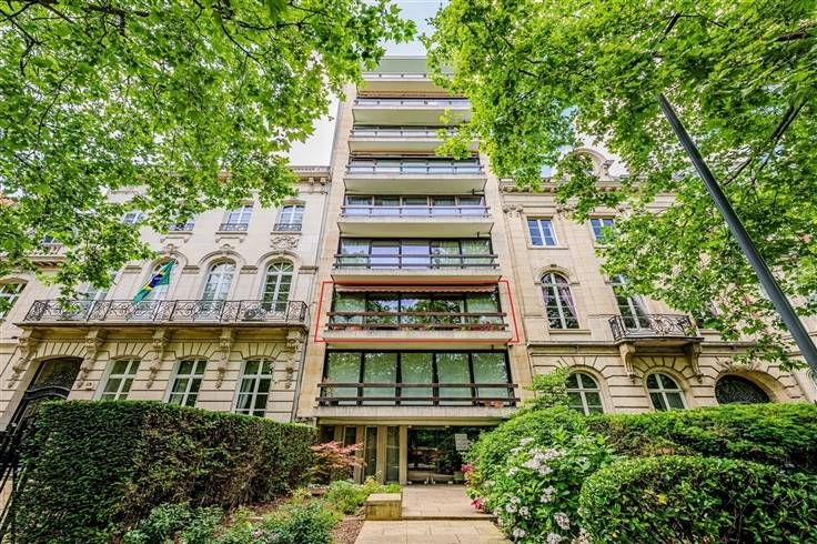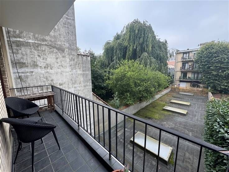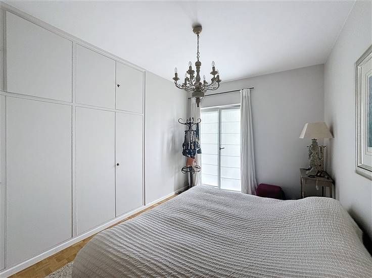 Op de tweede verdieping: grote inkomhal met privélift, woonkamer van 45m² met parket en FO en toegang tot het balkon, volledig uitgeruste keuken. Nachthal die leidt naar 2 slaapkamers (±14m²) met toegang tot het achterterras, waarvan één met en-suite badkamer, een bureau (±8m²), een grote badkamer met toegang tot het achterterras en apart toilet met wastafel. Een kelder maakt het appartement compleet. Mogelijkheid tot het huren van een grote parkeerplaats (een grote auto + fiets) voor 150€.
