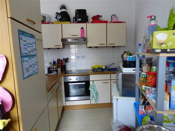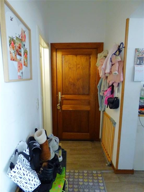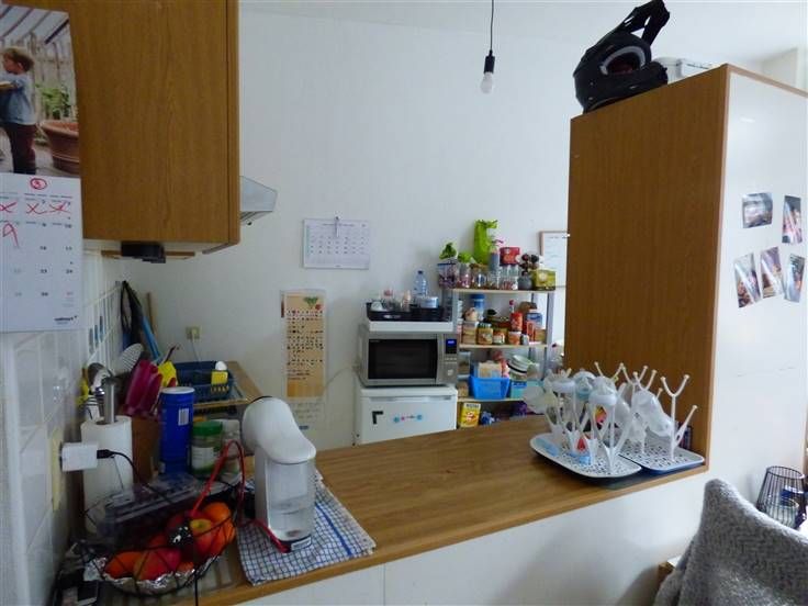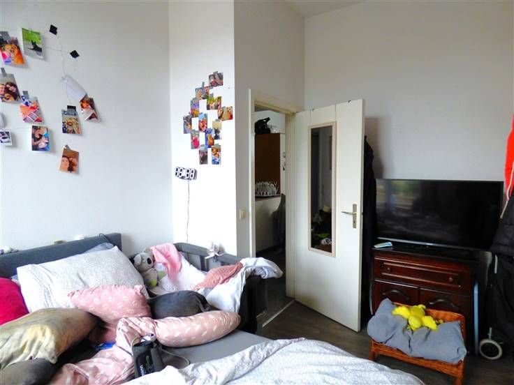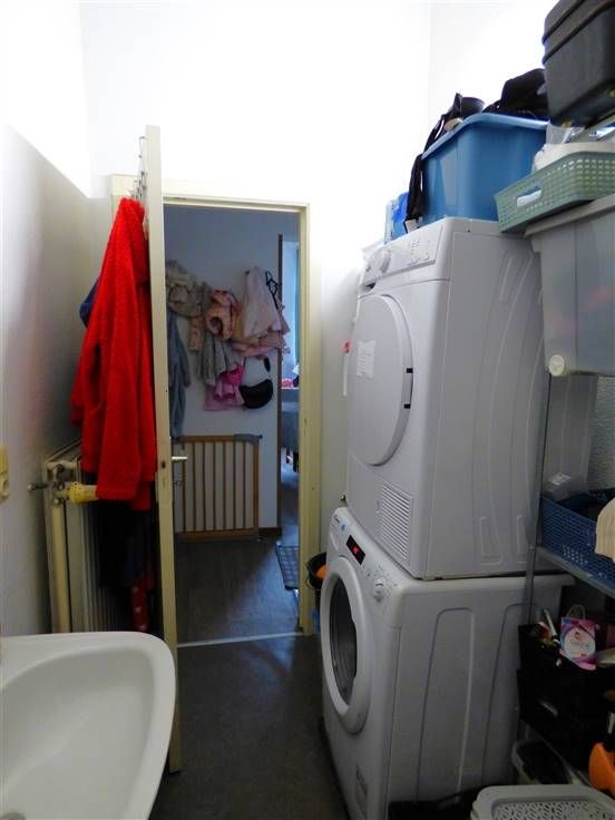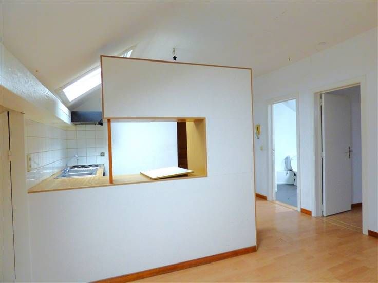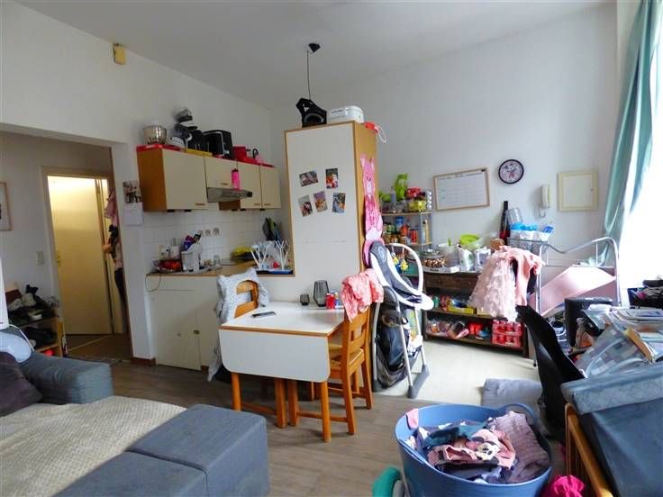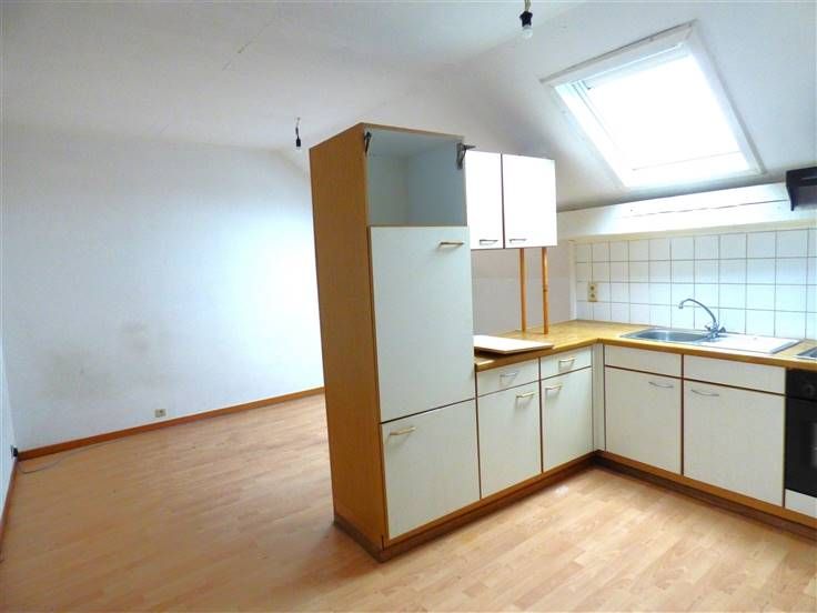 Eerste verdiep : een appartement met één slaapkamer, living, open keuken, en badkamer.
