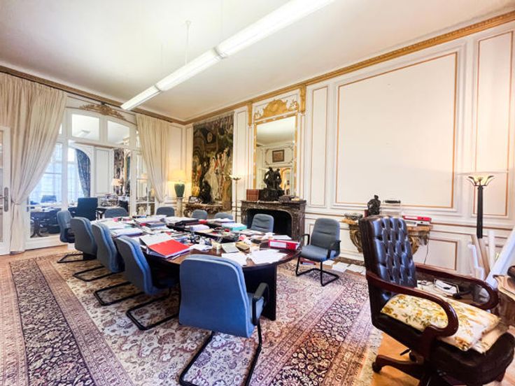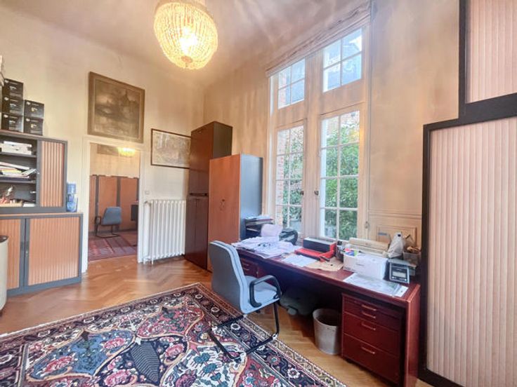 Het pand wordt momenteel gebruikt als kantoren en beschikt over een aangename tuin met een kleine vijver en 28 parkeerplaatsen (waarvan 4 boxen).