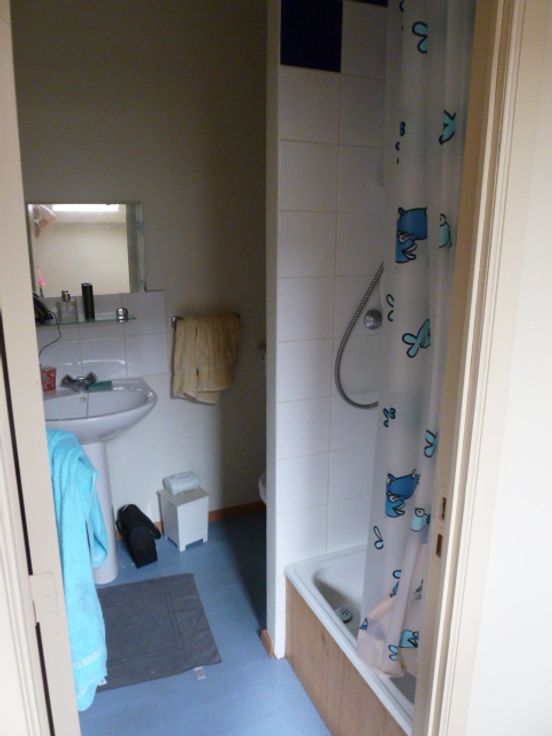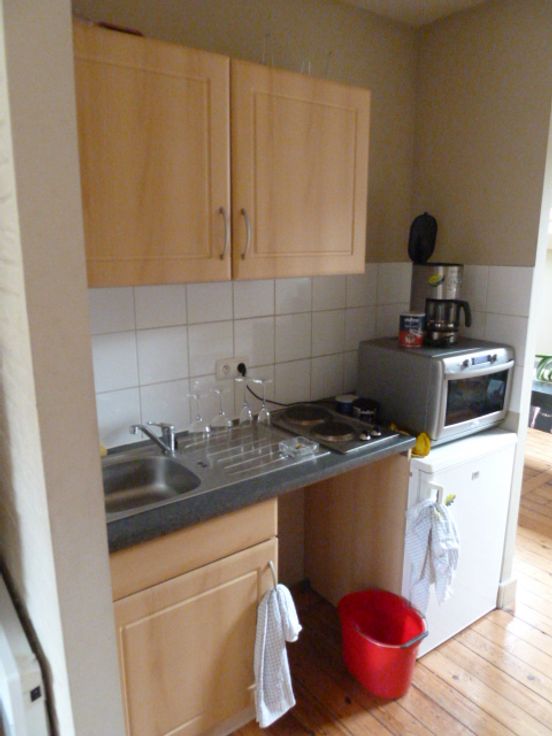 Il se compose d'un espace vie, une cuisine équipée (taque de cuisson 2 zones, meuble bas et haut et frigo), un séjour, une salle de douche avec WC et une mezzanine.