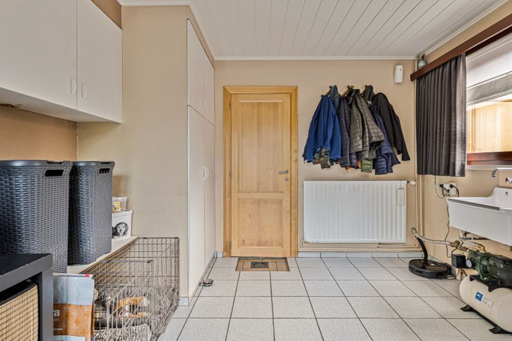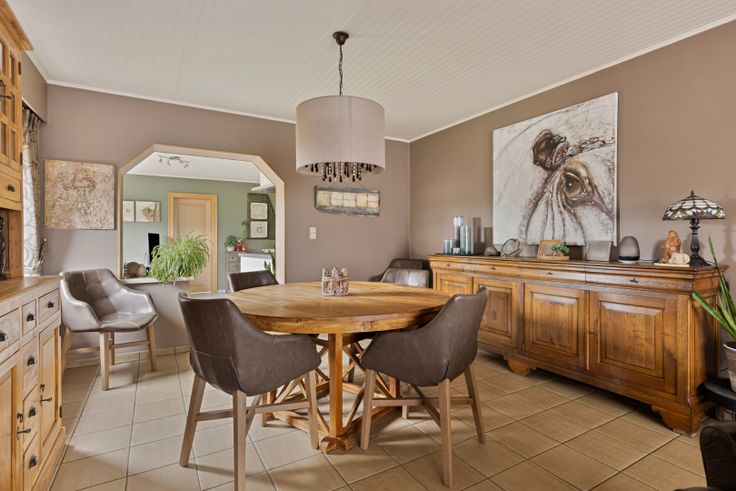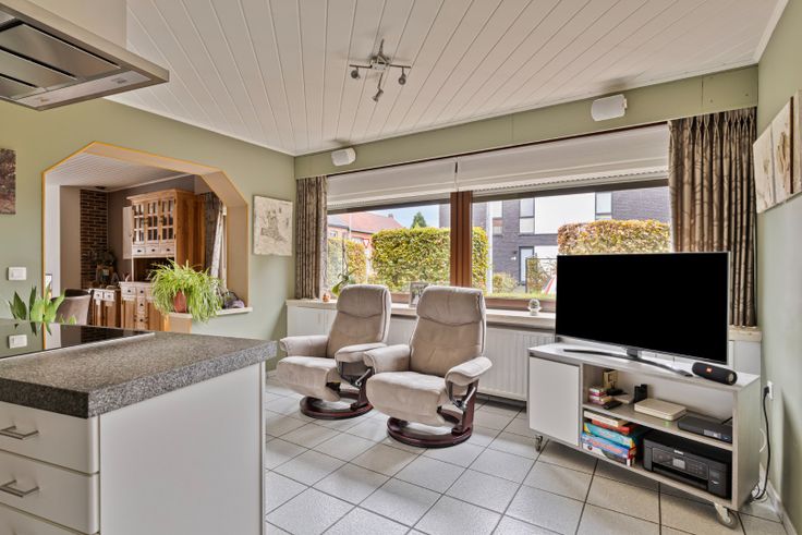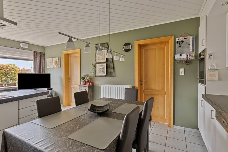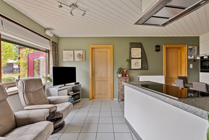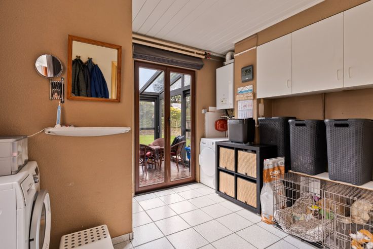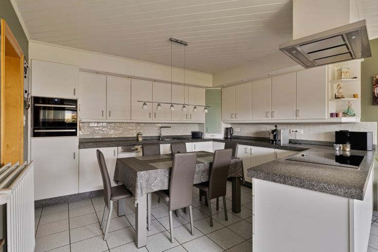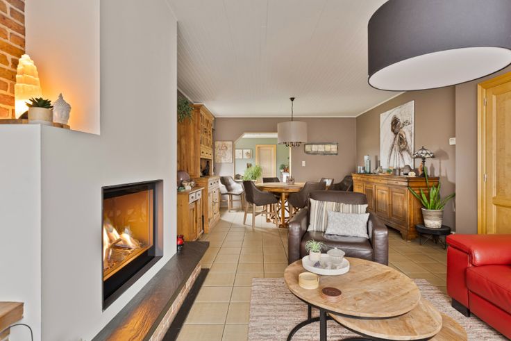 Via de inkomhal betreed je de ruime woonkamer, opgedeeld in een zithoek met recente gashaard en een eethoek. De aansluitende keuken is uitgerust met een koelkast, vaatwasser, inductievuur, dampkap, combi-oven en granieten werkbladen. Er is ruimte voor een eettafel.