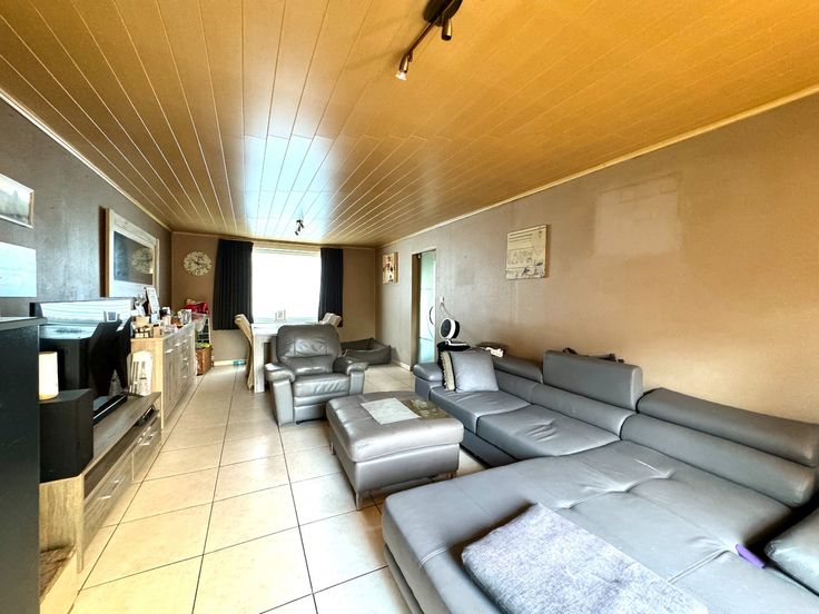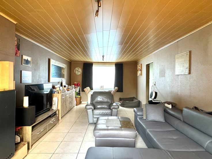 Inkomhal met lichtrijke leefruimte met aanpalend de keuken en de badkamer.