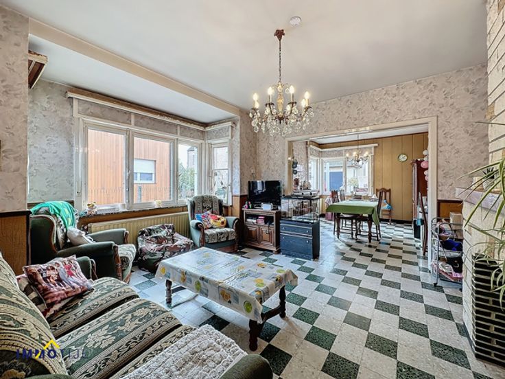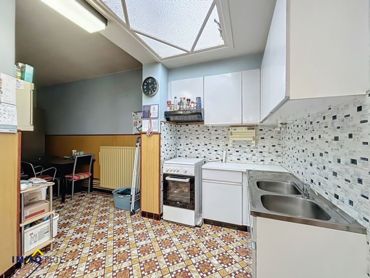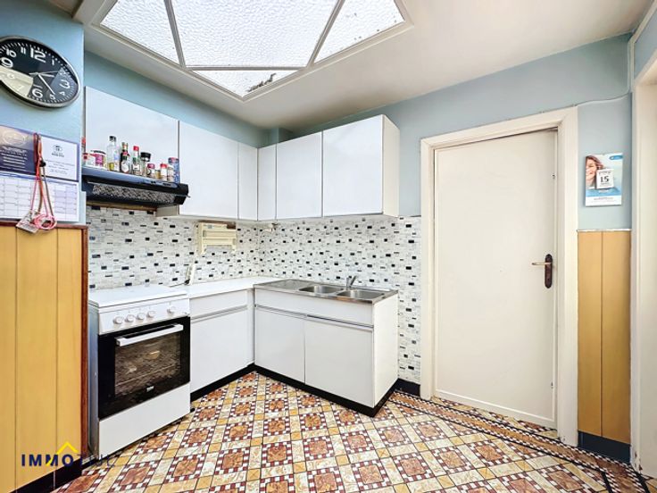 Deze op te frissen woning biedt op het gelijkvloers een inkomhal, een gezellige woonkamer met eetplaats, en een keuken met directe toegang tot de veranda. Verder is er een handige berging met aansluitingen voor een wasmachine en droogkast.