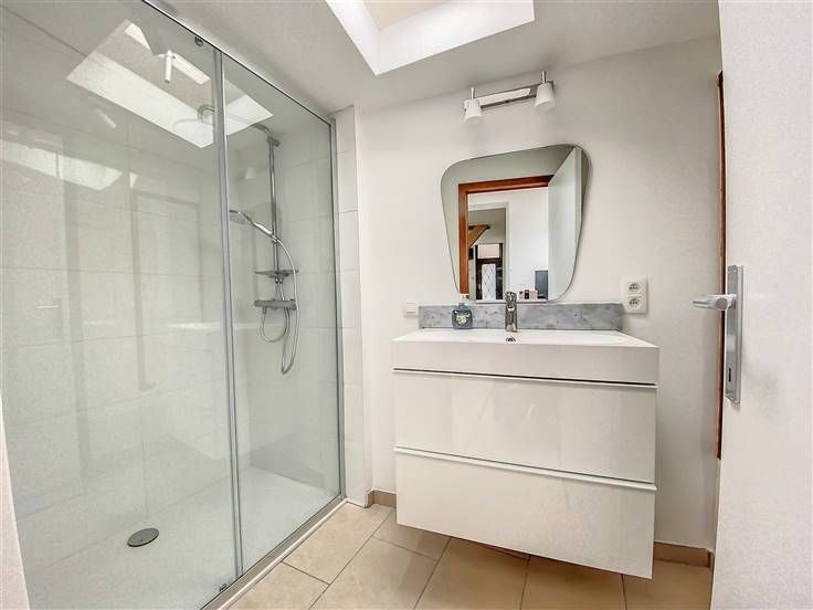 Rez: Séjour, cuisine semi-équipée, salle de douche avec WC.