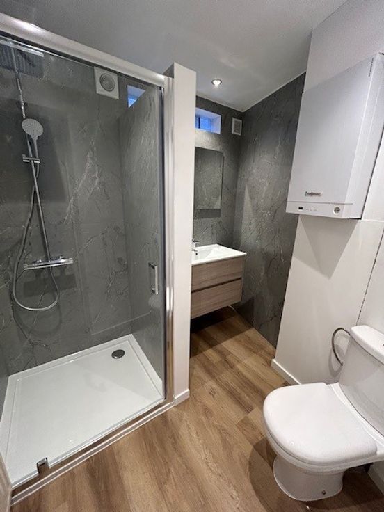 Vernieuwde badkamer met douche, toilet en wastafel