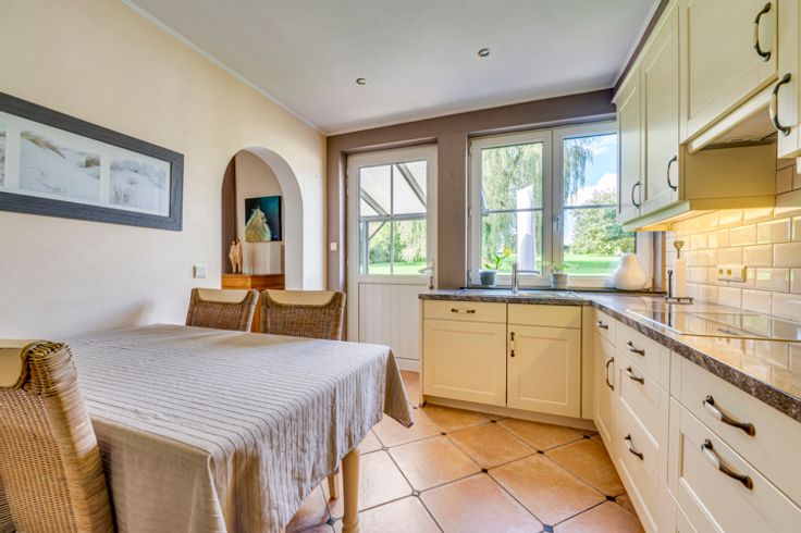 Samenstelling op de begane grond: hal, grote woonkamer/eetkamer van 34m² uitgerust met een pelletcassette, ingerichte keuken, slaapkamer/kantoor van 14m², doucheruimte, garage/wasruimte, toilet en hal die naar boven leidt.