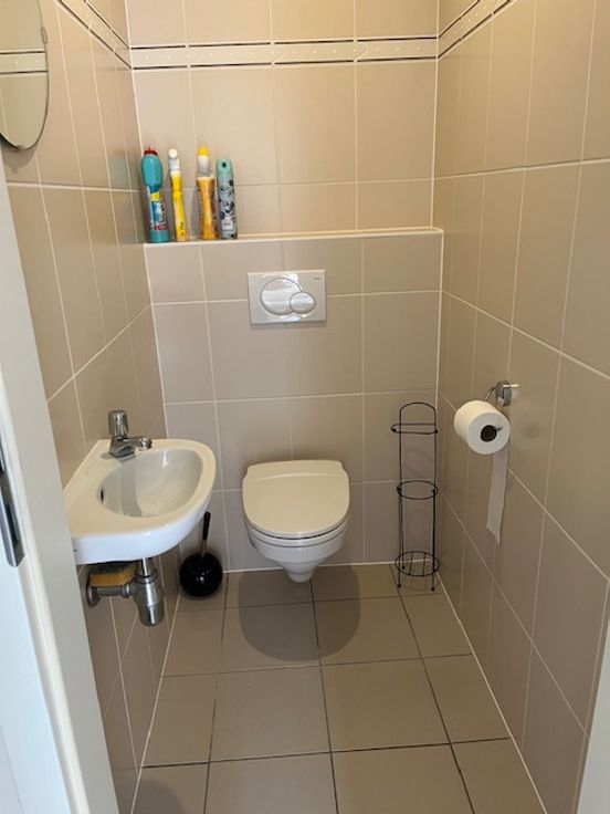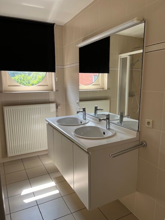 Badkamer met douche,2 lavabo’s en bad (12,6 m2) 2 slaapkamers ( 15 m2 en 12 m2) Bergruimte en apart toilet .Zolder