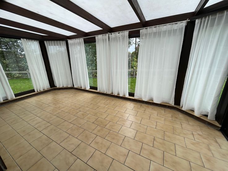 Ruime woonkamer met kachel en aansluitend veranda met uitzicht op de tuin;