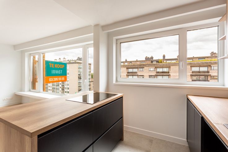 Dit ruim twee slaapkamer appartement is gelegen op de zesde verdieping van een goed onderhouden appartementsgebouw aan de Dascottelei te Deurne-Zuid. Deze ideale ligging zorgt voor een vlotte verbinding met zowel de stad als alle andere omliggende gemeenten. Winkels, bakkers, banken, supermarkten, openbaar vervoer en andere zijn op wandelafstand. Het Boekenbergpark en het Te Boelaerpark zijn vlakbij gelegen. Het appartement bestaat uit: een inkomhal - een ruime woonkamer - een open keuken met AEG toestellen - een badkamer met inloopdouche - een apart toilet - twee slaapkamers - terras aan de grootste slaapkamer. Het appartement werd volledig gestript en alle privatieve elektrische en sanitaire leidingen werden vernieuwd. In de keuken, badkamers en toiletkamer worden er lichtgrijze keramische tegels geplaatst en spots voorzien in het plafond. In de woonkamer, hallen en slaapkamers worden er parkettegels gelegd. De keuken wordt voorzien van een ijskast, vriezer, inductiekookplaat met ingebouwde dampkap, oven, combi-oven, vaatwasser en wastafel. Er werden overal voldoende stopcontacten voorzien en er wordt een conforme keuring geleverd. De ramen zijn ook vernieuwd. Vaste kosten: maandelijkse bijdrage voor het appartement €175 met verwarming (gas) en water inbegrepen. Het reservefonds wordt gefinancierd door de reclameborden op de zijmuren. Privatieve ondergrondse kelder inbegrepen.