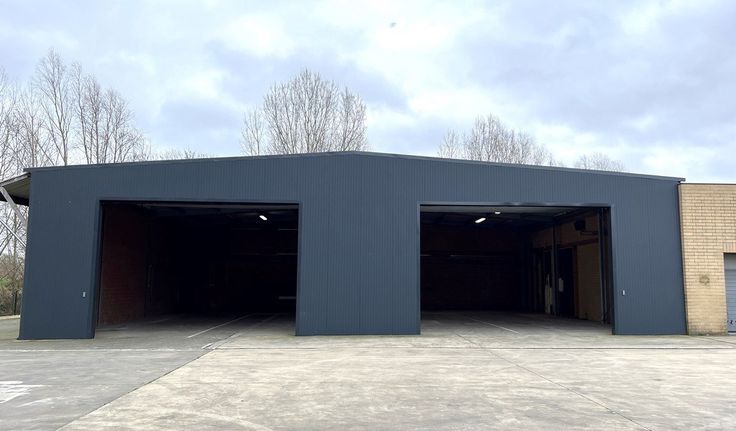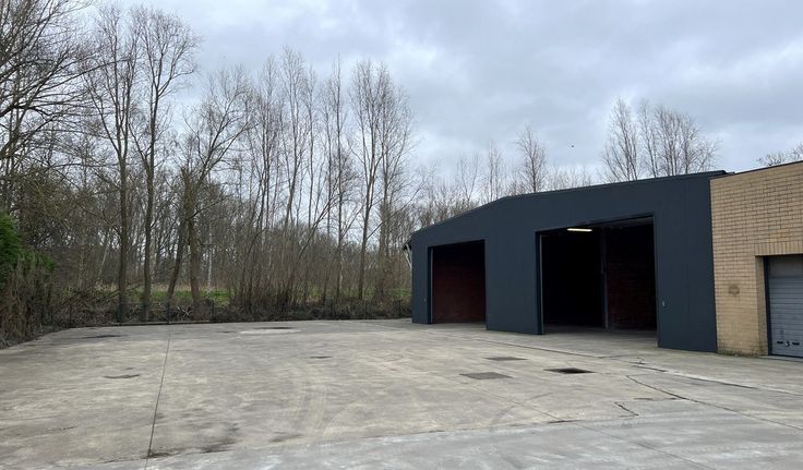 Specificaties: staalstructuur, aluminium sandwichpanelen, 1 automatische sectionaalpoort 6m (b) x 4m (h), geïsoleerd steeldeck dak, tl-armaturen, polybetonvloer, drijfkracht, KVA: 3x400V+N, 350m² buitenopslag en manoeuvreerruimte voor vrachtwagens
