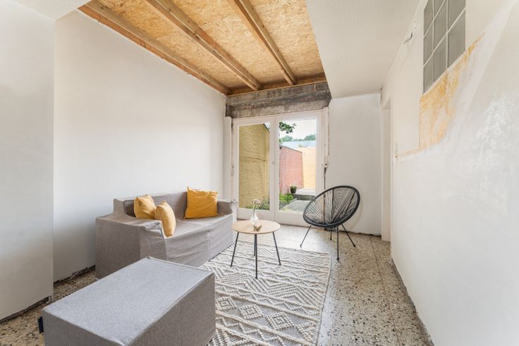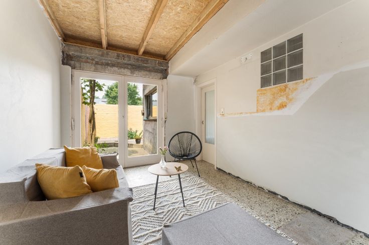 De woning zelf (bewoonbare oppervlakte: 210 m²) biedt tal van mogelijkheden en vraagt nog verdere afwerking. Het gelijkvloers beschikt momenteel over een multifunctionele ruimte (22 m²) die kan dienen als kantoor, atelier, wasruimte of fietsenberging. Deze ruimte is voorzien van handige ingebouwde kasten. Verder zijn er op het gelijkvloers twee extra ruimtes (23 m² en 14 m²) die nog ingevuld kunnen worden, bijvoorbeeld als slaapkamer of berging. De muren zijn reeds gepleisterd en de leidingen voor elektriciteit en water zijn aanwezig. Daarnaast is er een toilet op het gelijkvloers en een zonnig, afgesloten tuintje waar u in alle rust en privacy kunt genieten.