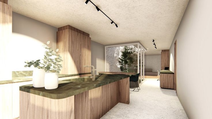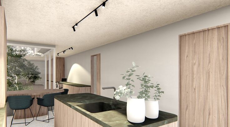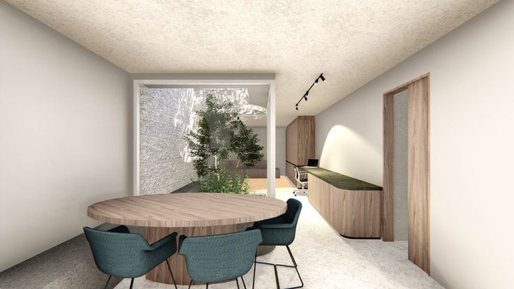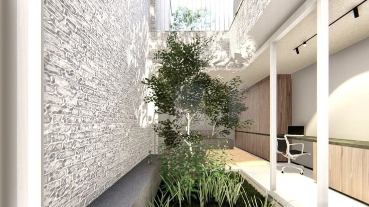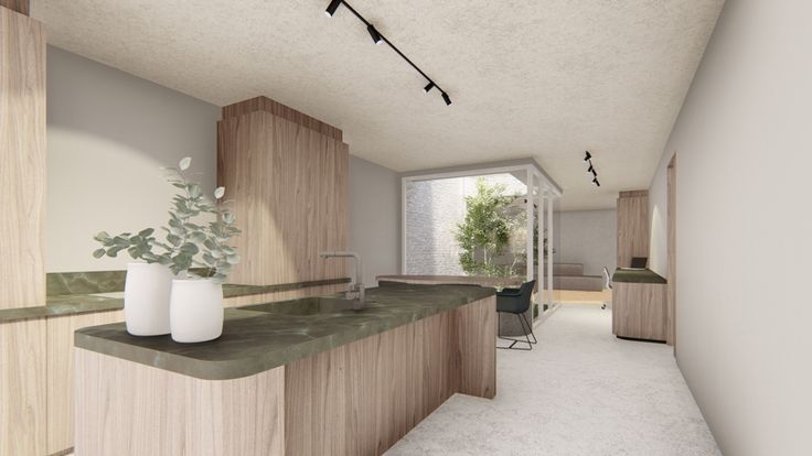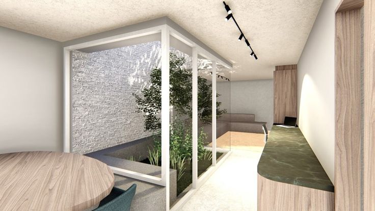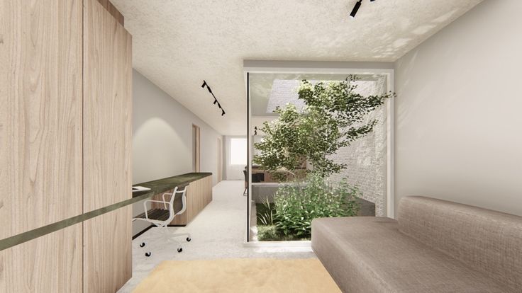 Gelijkvloers: Ruime inkomhal mat gastentoilet en berging die gebruikt kan worden als vestiairekast, verder krijgt men toegang tot de open keuken met keukeneiland en zit- en eetplaats, een ingebouwde bureau die langs de tuin die verder loopt naar de leefruimte. In midden van de leefruimte bevindt zich een boom met zithoek die met glas omringd is, hierdoor wordt de volledig ruimte op een natuurlijke manier verlicht.
