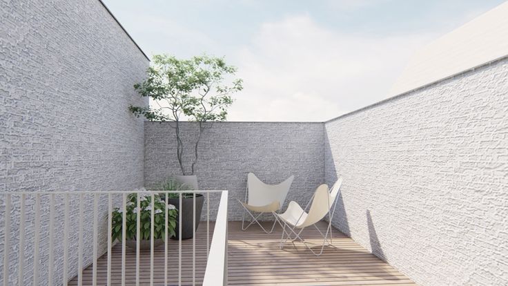 Eerste verdieping: Via de nachthal krijgt men toegang tot twee slaapkamers, de badkamer, een apart toilet en het ruime terras van 21m2.