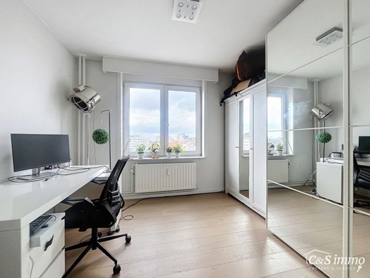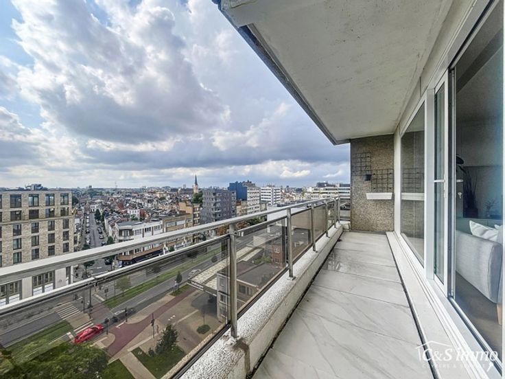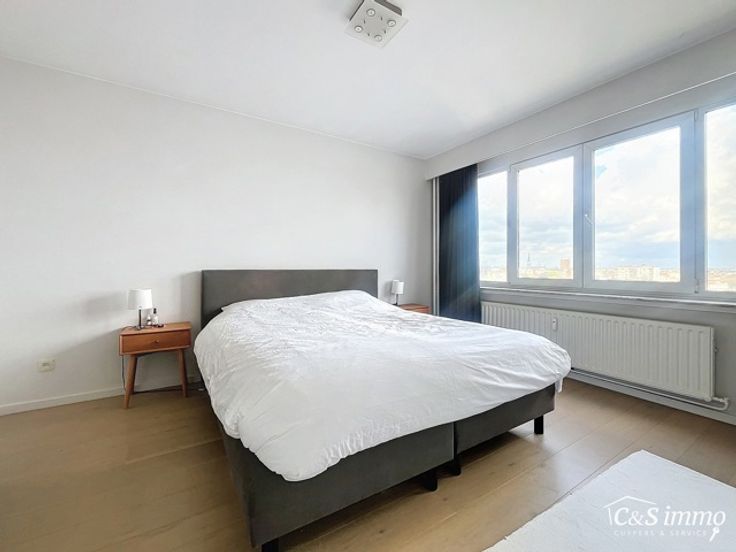 Stijlvol gerenoveerd '2020 hoekappartement op de 9e verdieping met adembenemend uitzicht over Zurenborg en de Stad. De ruime inkomhal biedt ingebouwde vestiairekasten en een apart toilet met handenwasser. Aan de voorzijde bevindt zich de lichte, royale woonkamer (ca. 37m²) met parketvloer en op maat gemaakte kasten. Via het nieuwe schuifraam heeft u toegang tot het zonnige terras, waar u kunt genieten van een prachtig panorama over de Stad Antwerpen. De vernieuwde keuken is uitgerust met hoogwaardige, moderne toestellen, zoals een inductiekookplaat, dampkap, oven, microgolfoven, vaatwasser en een koelkast met aparte diepvries. Een gezellige ontbijthoek vervolledigt deze ruimte. Het appartement beschikt over drie volwaardige slaapkamers (ca. 16-12-11m²), allen voorzien van een parketvloer. De stijlvolle badkamer is uitgerust met een badkamermeubel, een inloopdouche en aansluitingen voor een wasmachine. Het appartement werd recent met oog voor detail gerenoveerd '2020 en heeft dubbele beglazing. De elektriciteit is volledig conform. Nieuwe videofonie, veiligheidsdeur. Er is ook de mogelijkheid tot aankoop van een garagebox. Dit is de perfecte kans om te wonen in een instapklaar appartement, voorzien van alle moderne comfort op een toplocatie, op slechts 2 minuten wandelen van de bruisende Dageraadplaats in de geliefde Zurenborgwijk, met tal van gezellige cafés, restaurants en prachtige architectuur binnen handbereik. Mogelijkheid tot aankoop garagebox in het gebouw.