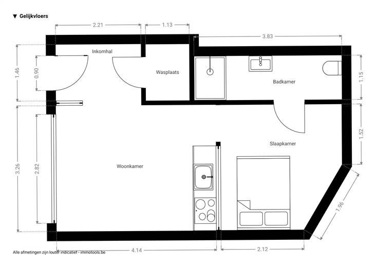 Je komt er binnen door de matglazen voordeur, en stapt de inkomhal binnen, waar je plaats hebt voor een kapstok. De mooie parketvloer die je hier ziet, loopt door over de gehele ruimte. Met 15 m² is de leefruimte met open keuken ruim voor een studio, met een groot raam over de hele gevelbreedte. Mits een slim, multifunctioneel meubel kan je hier zowel eten en dingen opbergen, als comfortabel zitten!