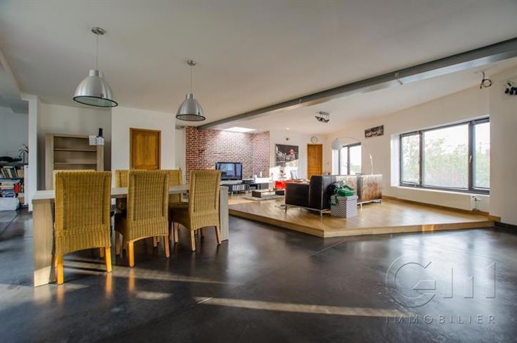 MOUSCRON  Situé au premier étage d'un immeuble de deux appartements et à quelques pas du centre-ville mouscronnois tout en restant au calme, ce magnifique loft de +/- 210 m² ayant fait l'objet d'une rénovation totale se compose de : * Rez-de-chaussée : hall d'entrée desservant un vaste et lumineux living (salon en estrade et salle à manger). Cuisine équipée ouverte (mobilier, hotte, taque au gaz, four, lave-vaisselle, double évier et ilot central).  Suite parentale composée d'une grande chambre avec salle de douches privative (douche à l'italienne, meuble lavabo et WC).  Grand bureau ouvert sur le séjour + WC séparé avec lave-mains et coin buanderie.  Hall de nuit offrant un accès à 2 chambres de +/- 15 m² et +/- 12 m² ainsi qu'une seconde salle de bains avec baignoire, meuble lavabo double vasque et sèche serviette. * Extérieur : lumineuse terrasse accessible par le living et par la suite parentale. * Particularités : superbe loft rénové en 2014 offrant de beaux volumes. Aucune charge de copropriété et accès individuel. Toiture neuve. Châssis alu avec double vitrage.  Chauffage central au gaz (chaudière "Vaillant" + radiateurs partout), spots intégrés, VMC, électroménager de marque "Bosch", béton lisse au sol. Installation électrique 100% conforme. Excellent PEB : B.