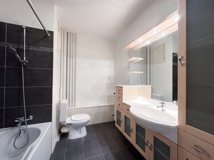 - Salle de bain avec baignoire/douche, WC et évier