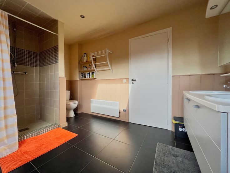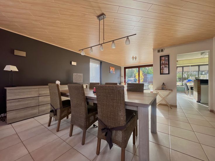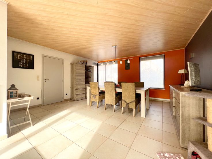We treden de woning binnen via de inkomhal met gastentoilet. De inkomhal verleent rechtstreeks toegang tot de lichtrijke en sfeervolle woonkamer, voorzien van een zithoek met houtcassette én een ruime eethoek. Aansluitend bevindt zich de volledig uitgeruste keuken (kookplaat, dampkap, combi-oven, vaatwas en koelkast + ingemaakte kasten) + eethoek. Nabij de keuken treffen we een praktische berging aan.