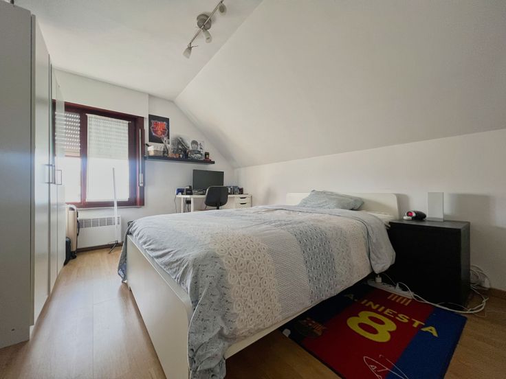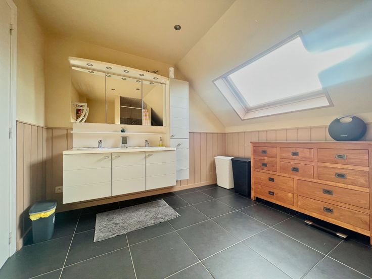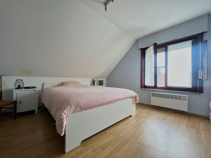Via de vaste trap in de inkomhal, bereiken we het eerste verdiep. De eerste verdieping bestaat uit drie volwaardige slaapkamers alsook een ingerichte badkamer. Deze laatste beschikt over een dubbel lavabomeubel, een douche en een toilet. Het eerste verdiep biedt tevens toegang tot de zolderruimte, via een valtrap.